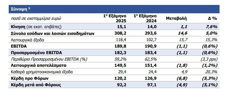 Κατά το 1ο εξάμηνο του 2025, τα συνολικά κέρδη προ φόρων, τόκων και αποσβέσεων (EBITDA) διαμορφώθηκαν σε 189,8 εκατ. ευρώ, μειωμένα κατά 0,6% σε σύγκριση με την αντίστοιχη περίοδο του προηγούμενου έτους. Το προσαρμοσμένο EBITDA διαμορφώθηκε σε 182,3 εκατ. ευρώ, ελαφρώς μειωμένο κατά 0,6% σε σχέση με το 1ο εξάμηνο του 2024, υποδηλώνοντας προσαρμοσμένο περιθώριο EBITDA για την περίοδο 59,2%, εναρμονισμένο με τους βραχυπρόθεσμους στόχους της Εταιρείας.