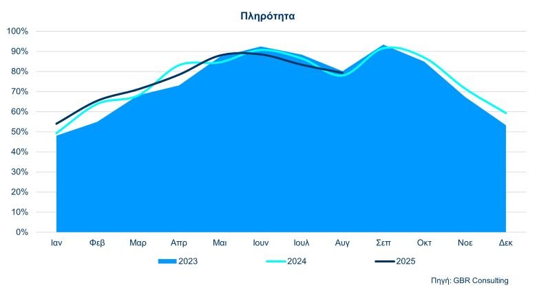 - Ο Αύγουστος 2025 κατέγραψε 79,3% μέση πληρότητα, έναντι 77,9% του περσινού Αυγούστου, εμφανίζοντας οριακή αύξηση της τάξης του 1,7% – σε συνέχεια δύο μηνών αιχμής με αρνητικό πρόσημο. Αξίζει να σημειωθεί πως η αντίστοιχη μεταβολή της μέσης πληρότητας του Αυγούστου 2025 έναντι του Αυγούστου 2023 φτάνει το (-) 1,1%.