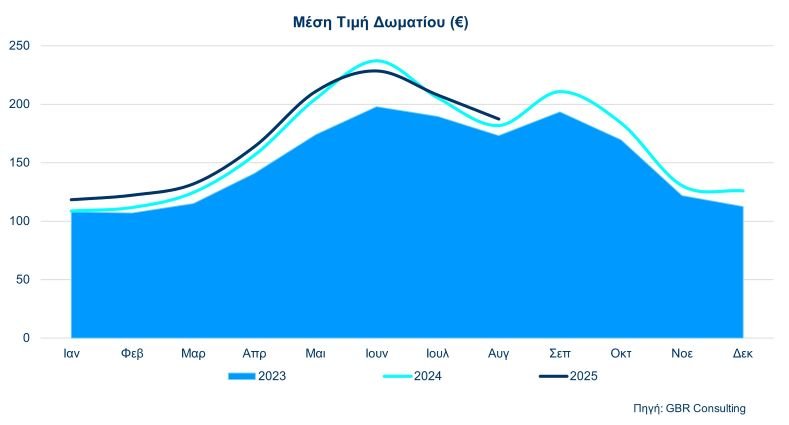 Μέση τιμή δωματίου Η Μέση Τιμή Δωματίου (ADR), τον Αύγουστο διαμορφώθηκε στα 187,30 ευρώ, έναντι 181,82 ευρώ του περσινού Αυγούστου δηλαδή παρατηρήθηκε μικρή αύξηση της τάξης του 3%, το δε RevPar Αυγούστου 2025 διαμορφώθηκε στα 148,47 ευρώ, έναντι 141,71 ευρώ του περσινού Αυγούστου, δηλαδή αυξήθηκε κατά 4,8.