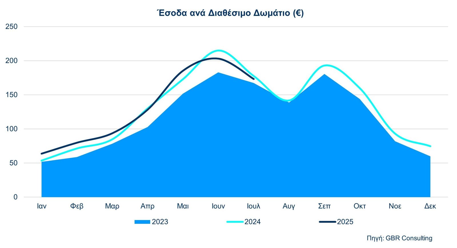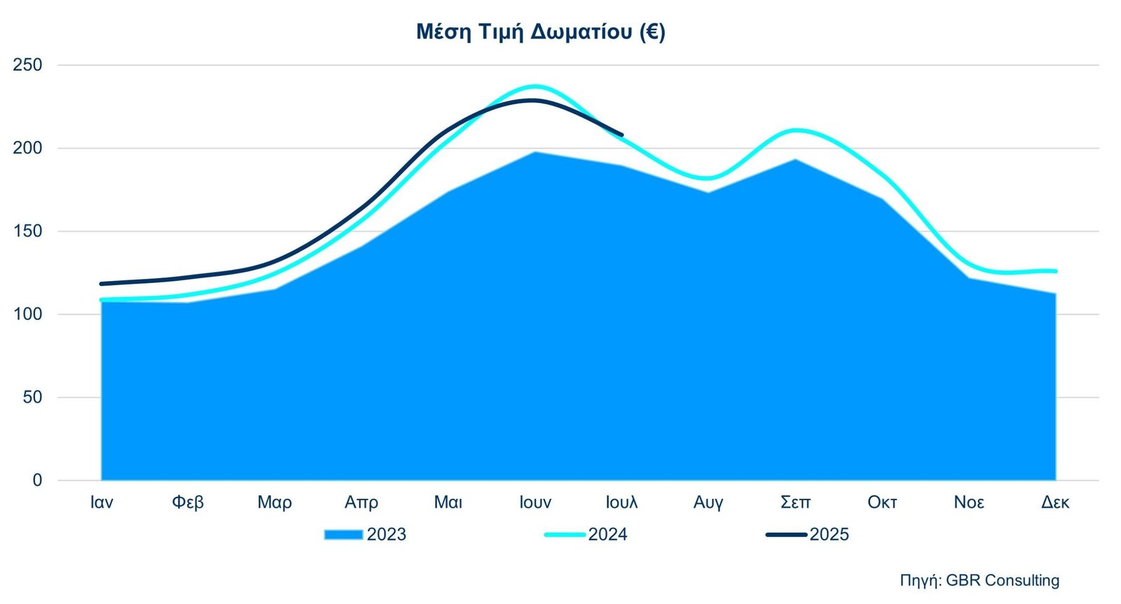 • Ο Ιούλιος 2025 κατέγραψε 83,3% μέση πληρότητα, έναντι 86,4% του περσυνού Ιουλίου, εμφανίζοντας μείωση της τάξης του (-) 3,6%, σε συνέχεια ενός Ιουνίου που επίσης παρουσίασε πτώση της μέσης πληρότητας κατά 2%. Αξίζει να σημειωθεί πως η αντίστοιχη αρνητική μεταβολή μέσης πληρότητας Ιουλίου 2025 έναντι του Ιουλίου 2023 φτάνει το (-) 5,7%. Η Μέση Τιμή Δωματίου (ADR), τον Ιούλιο διαμορφώθηκε στα 207,85 ευρώ, έναντι 205,54 ευρώ του περσινού Ιουλίου, δηλαδή παρατηρήθηκε μικρή αύξηση της τάξης του 1,1%, το δε RevPar Ιουλίου 2025 διαμορφώθηκε στα 173,19 ευρώ, έναντι 177,64 ευρώ του περσινού Ιουλίου, δηλαδή μειώθηκε κατά (-) 2,5%.