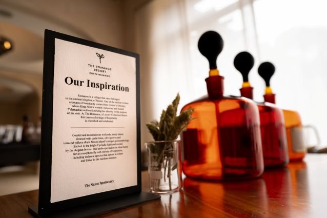 Πρόκειται για την πρώτη συλλογή του Naxos Apothecary που φέρει το όνομα του resort και εμπνέεται από την περιοχή, αναδεικνύοντας τον πλούτο της μεσσηνιακής φύσης και τα μοναδικά αρώματα των βοτάνων. Τα προϊόντα περιποίησης είναι διαθέσιμα σε όλα τα δωμάτια, τις σουίτες και τις βίλες του The Romanos Resort, προσφέροντας στους επισκέπτες μια ολοκληρωμένη εμπειρία ευεξίας, ενώ θα είναι διαθέσιμα online και στα φυσικά καταστήματα του Naxos Apothecary.